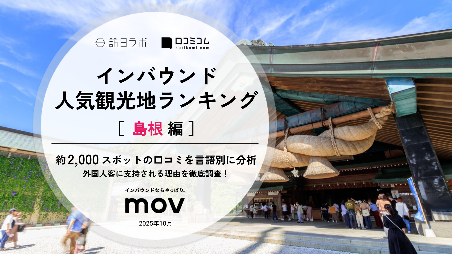 本レポートでは、島根の観光スポットに寄せられた口コミを調査。 約 600 件の外国語口コミをもとに訪日ラボが独自作成したインバウンド人気観光地ランキング[島根 編]を発表します!