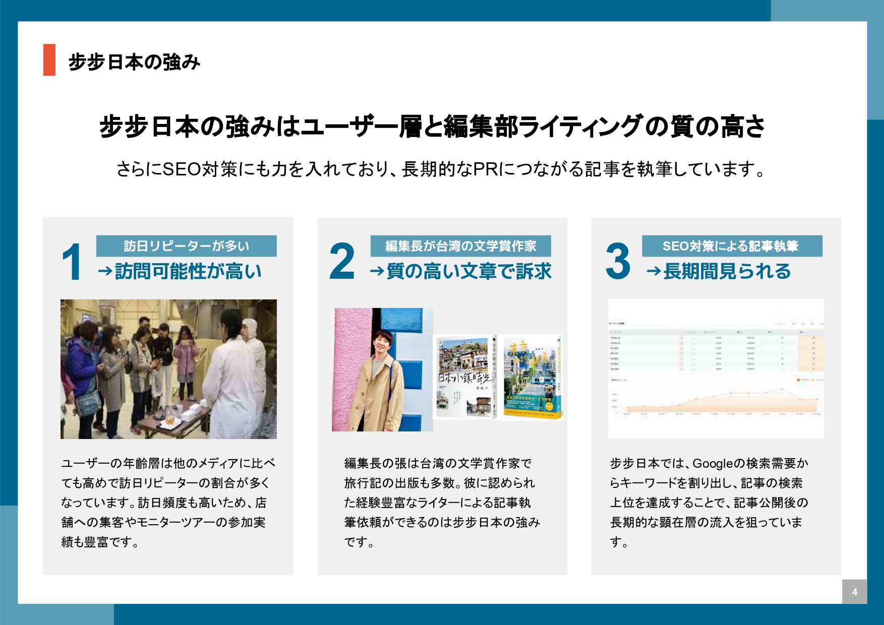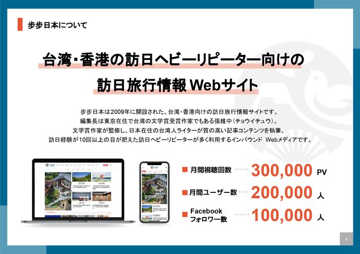 步步日本は2009年に開設された、台湾・香港向けの訪日旅行情報サイトです。編集長の張維中氏をはじめ日本を知り尽くした台湾人ブロガーが質の高い記事コンテンツを執筆。日本で流行している商品や施設情報から旅行記まで、日本在住の台湾人の視点で毎日発信しています。訪日回数10回以上のユーザー割合が30%と高く、台湾・香港の多くの訪日旅行リピーターに支持されています。步步日本では記事制作やだけでなく、Webアンケート調査やモニターツアーの実施も可能です。