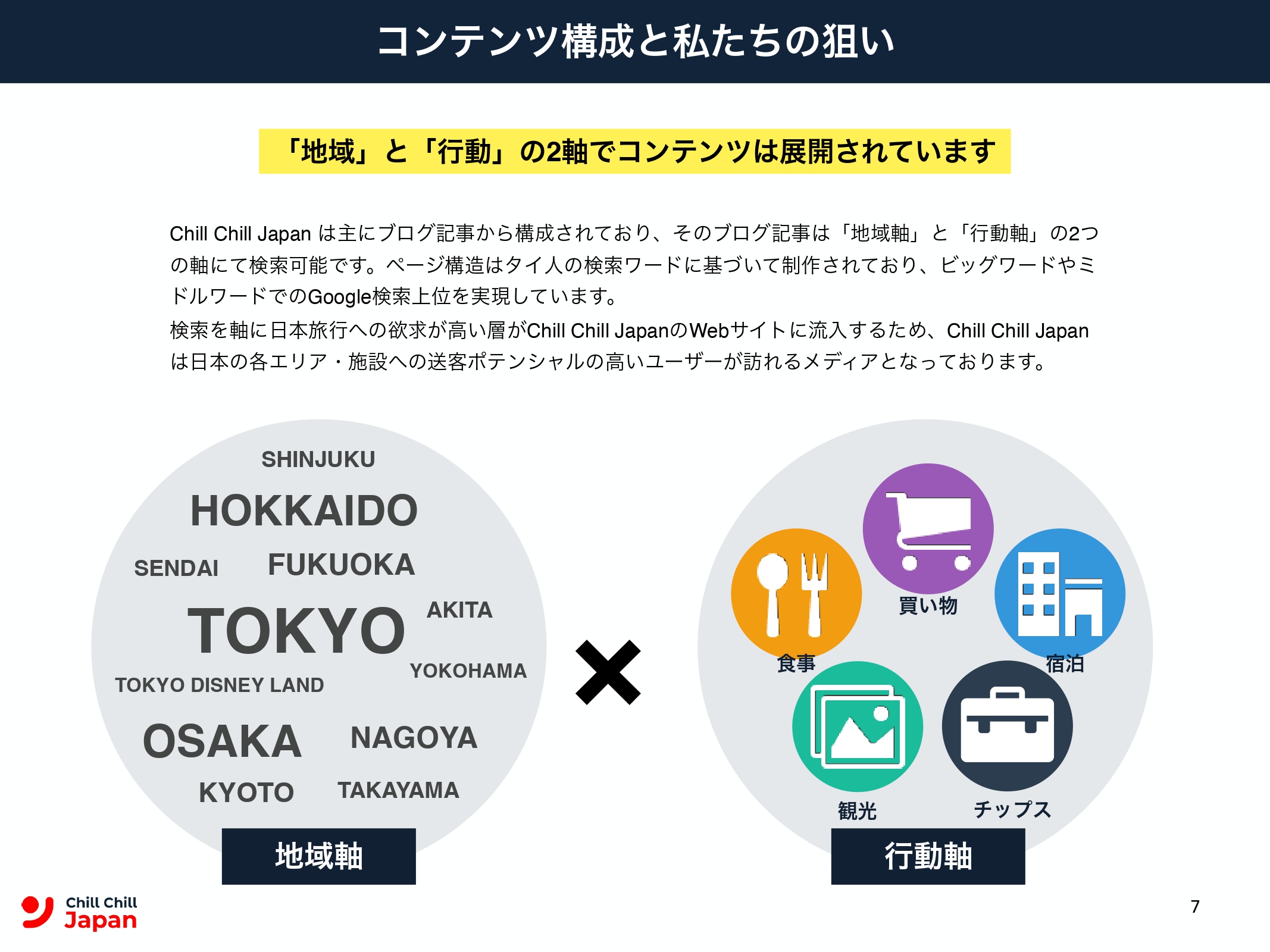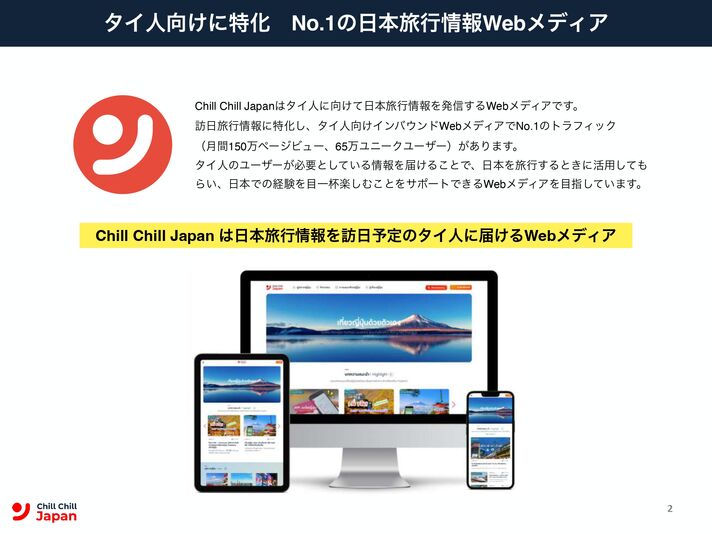 Chill Chill Japanは2015年12月に開設した、タイ人に向けて日本旅行情報を発信するWebメディアです。月間150万PVを突破し、タイ向けの訪日旅行WebメディアではNo.1のサイトです。