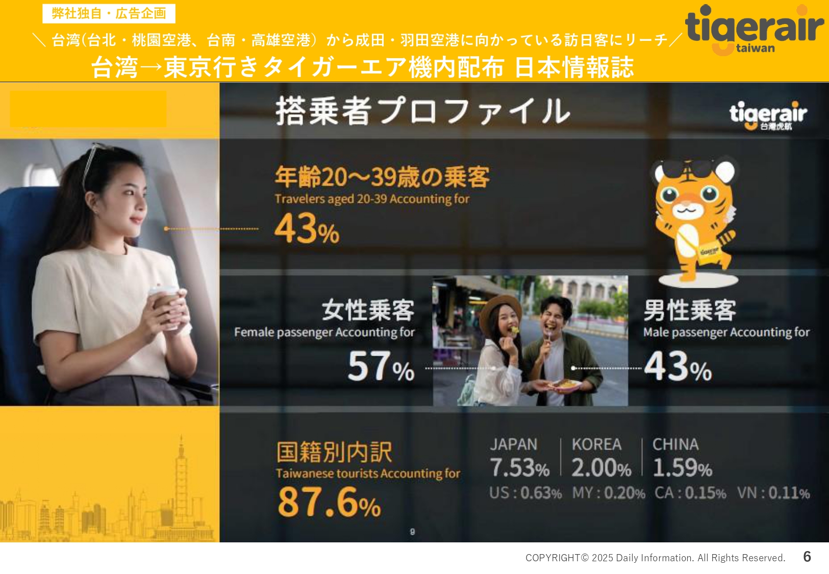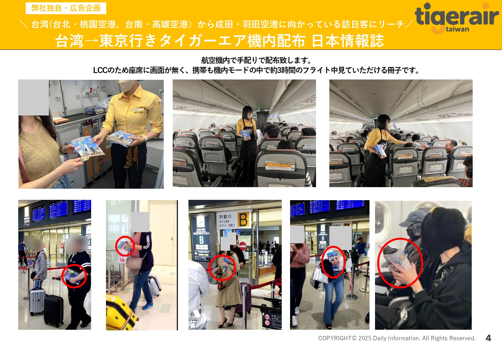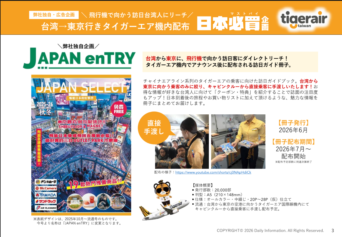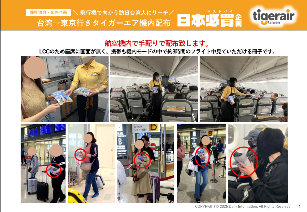 チャイナエアライン系列のタイガーエア機内でアナウンス後に配布される訪日ガイド冊子です。台湾から東京に向かう乗客のみに絞り、キャビンクルーから直接乗客に手渡しいたします!