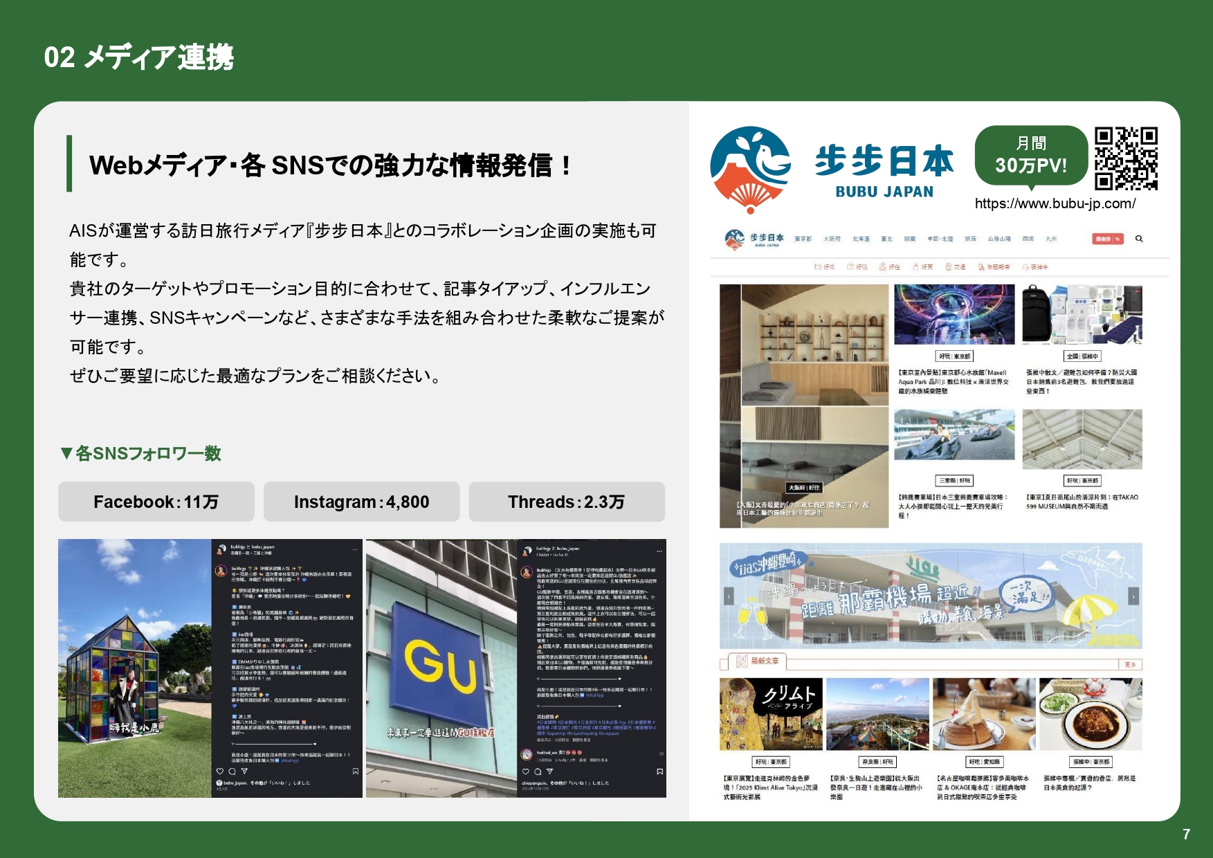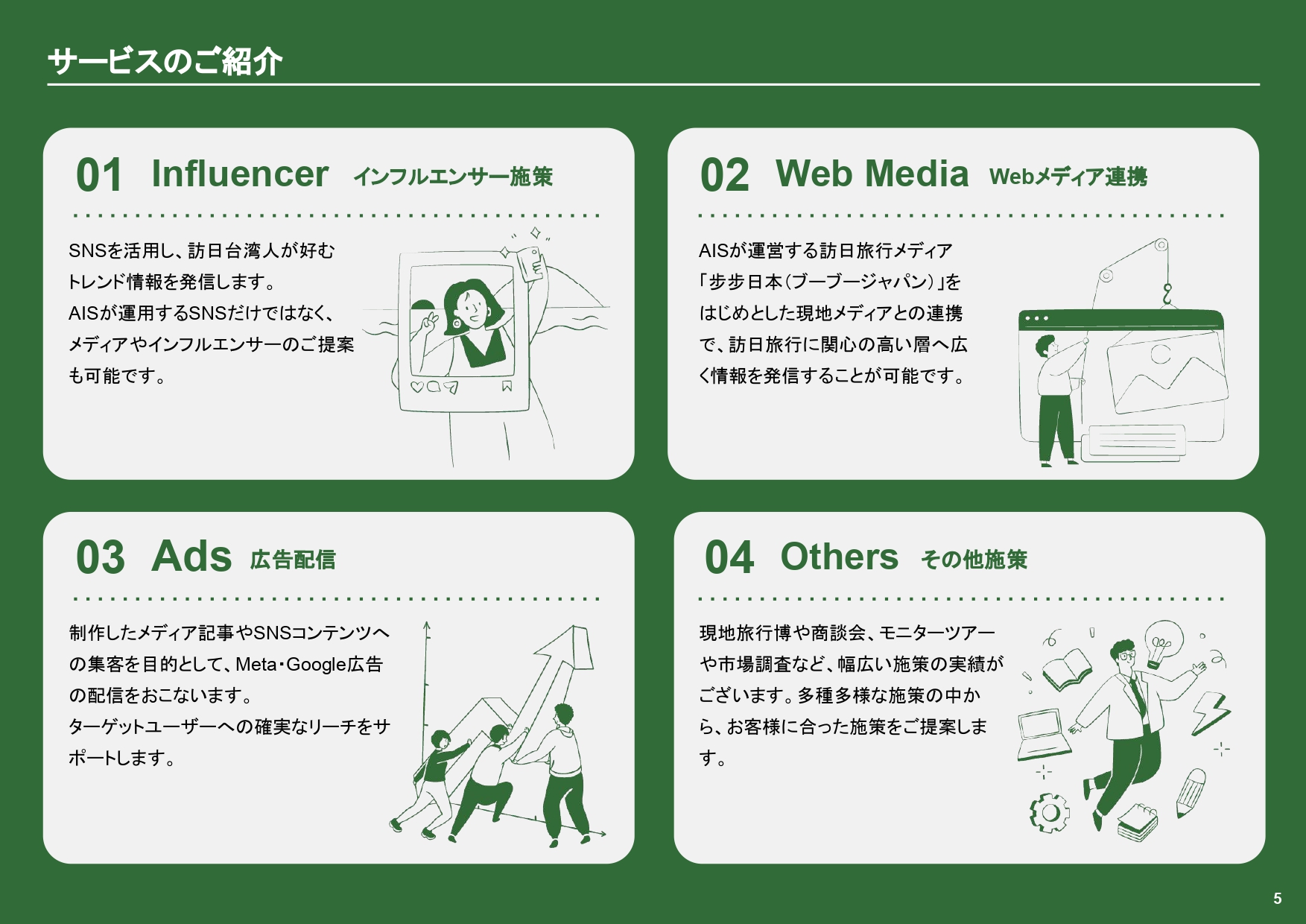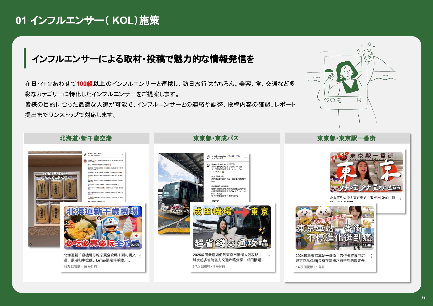 台湾・香港・中国・タイ市場向けWebメディアの運営をはじめ、PR戦略、インフルエンサー施策、現地プロモーション、宿泊施設運営、観光施設の企画・コンサルティングまで、幅広いサービスをワンストップで提供。