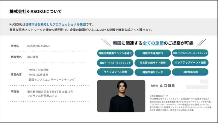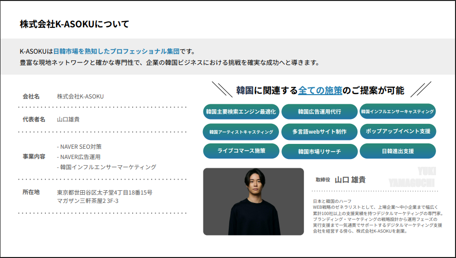 株式会社K-ASOKUは、韓国市場に特化したインバウンドマーケティング支援を提供する企業です。特にNAVER(韓国最大の検索エンジン)でのSEO対策を中心に、韓国人観光客の集客を実現します。日韓市場を熟知したプロフェッショナル集団として、豊富な現地ネットワークと確かな専門性で企業の韓国ビジネスを成功へと導きます。