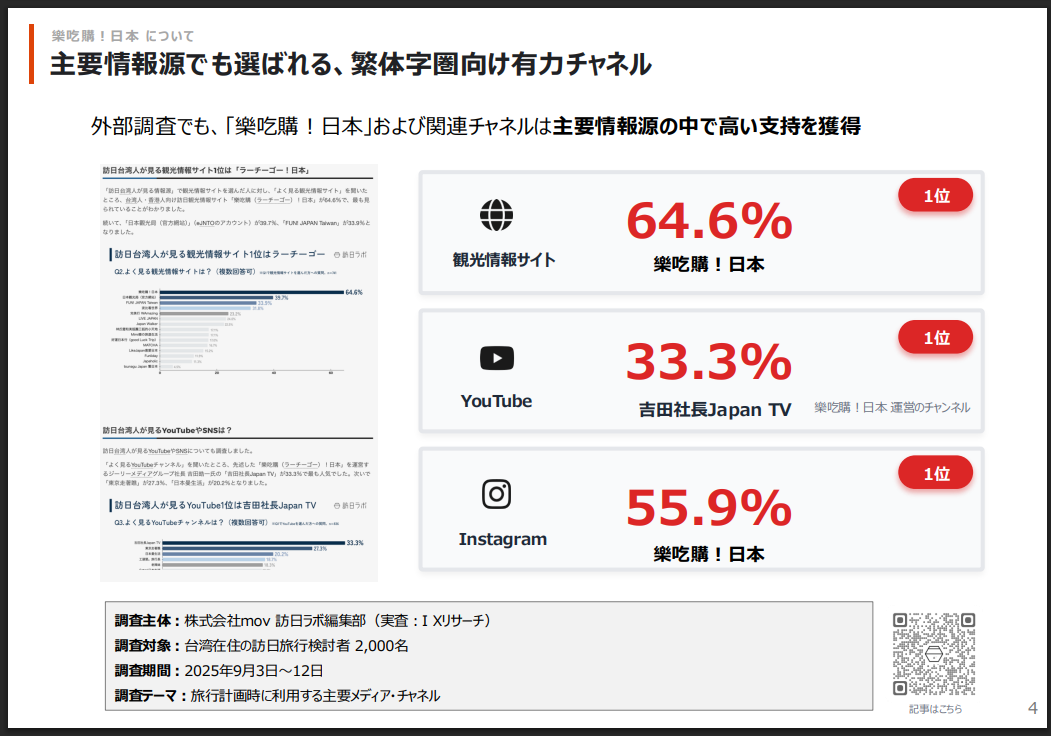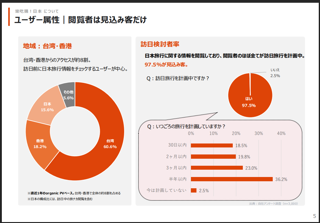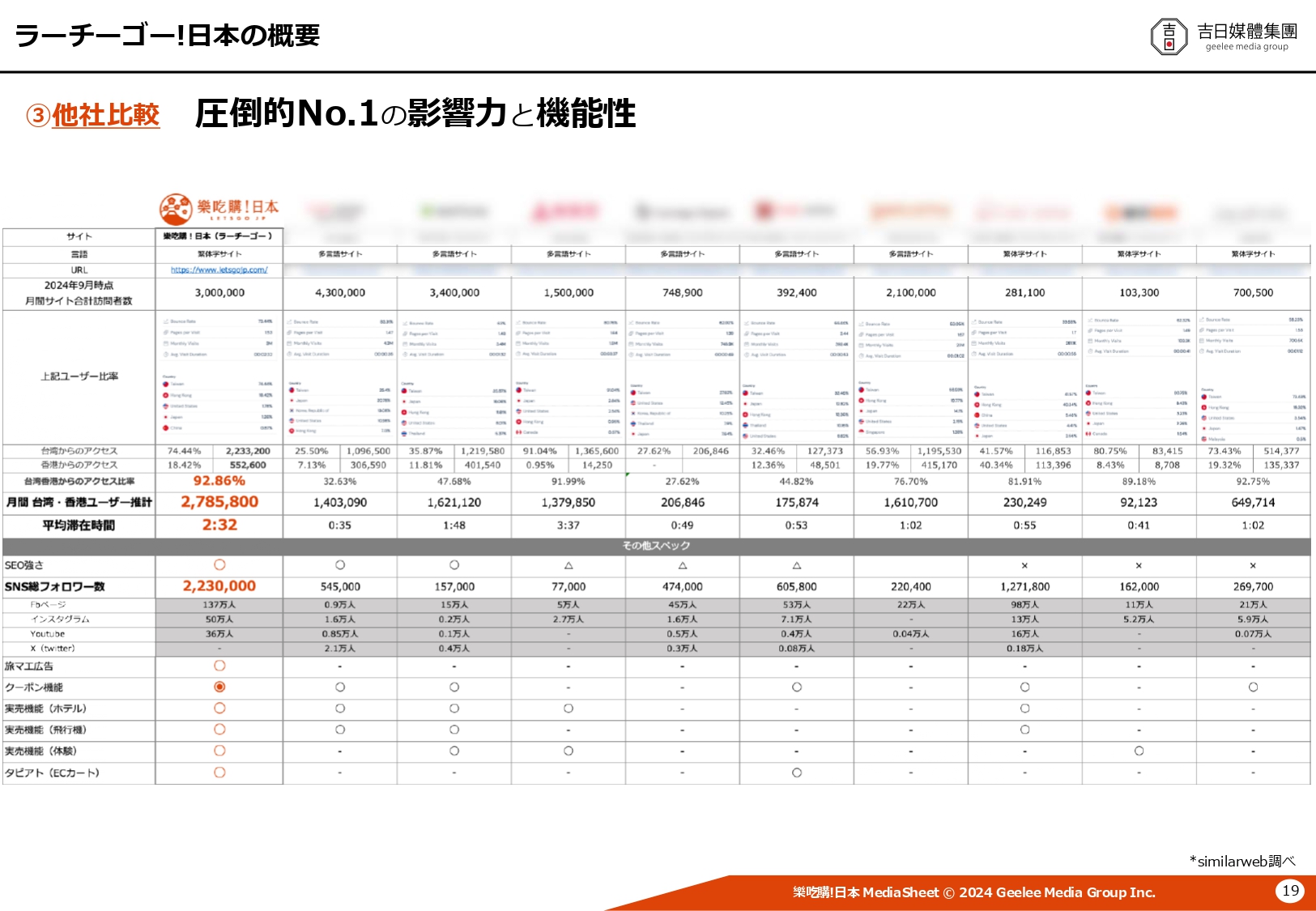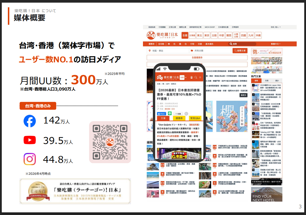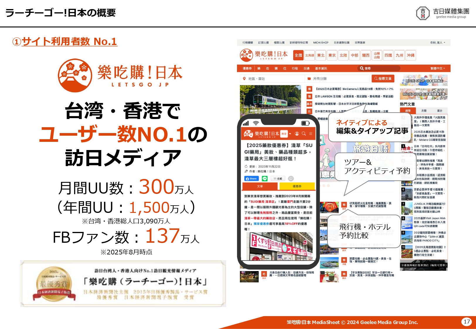 台湾人・香港人(中国語繁体字圏)に特化し、台湾人香港人向けNO.1のユーザー(月間ユニークユーザー300万)を擁する訪日観光メディアです。