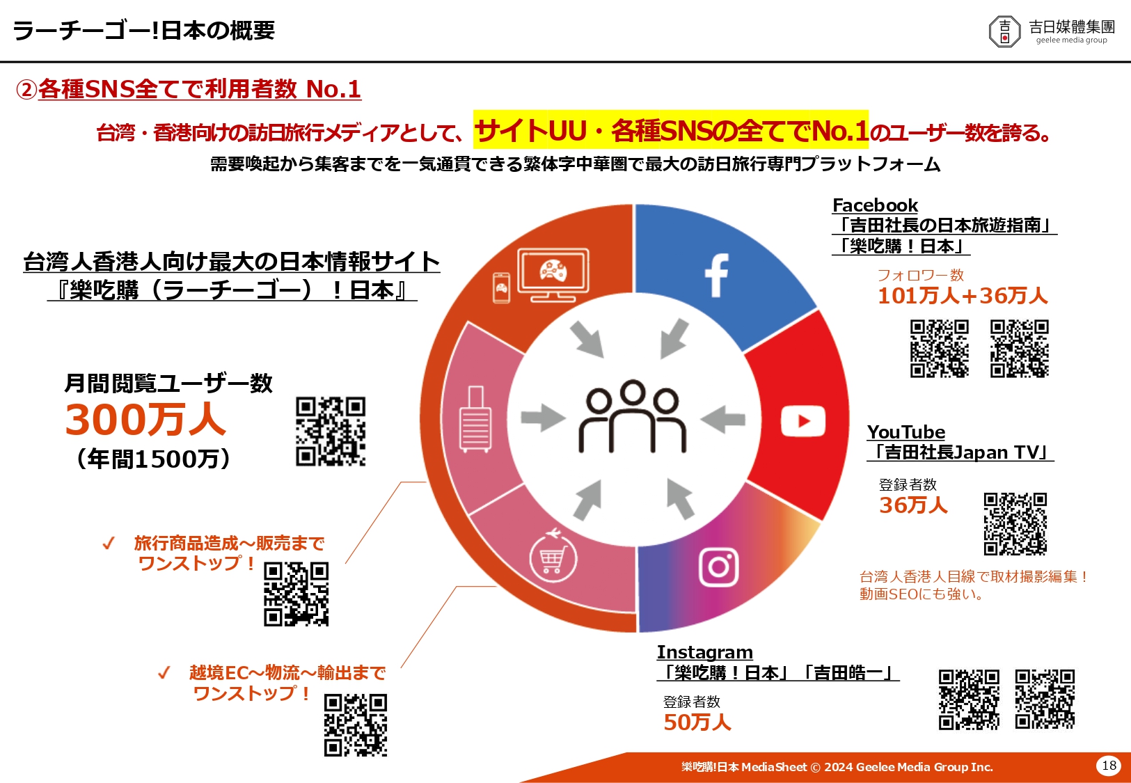 「樂吃購(ラーチーゴー)!日本」は日本に関するすべての情報を網羅し、ワンストップでユーザへ最新の情報を提供しています。 - ポイント4Facebookのファン数 累計約100万人!Instagramファン数40万人!