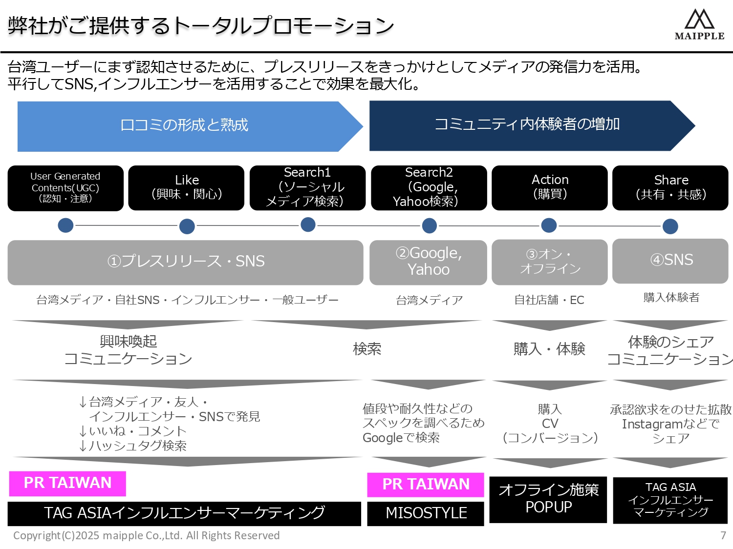 台湾ユーザーにまず認知させるために、プレスリリースをきっかけとしてメディアの発信力を活用。 平行してSNS,インフルエンサーを活用することで効果を最大化が可能です
